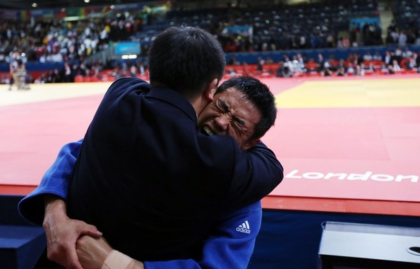 2012년 런던올림픽 남자 유도 -90kg급에서 결승전을 승리해 금메달을 차지한 송대남이 코치와 얼싸안고 환호하고 있다.